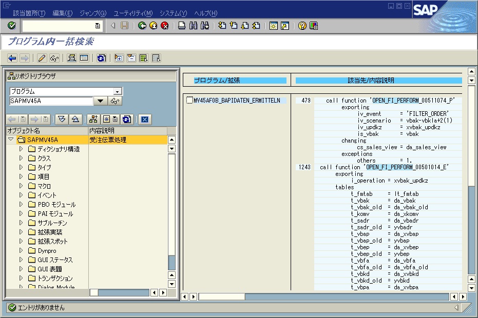 会計伝票を転記するプログラムSAPMF05Aを例として、プログラム内の一括検索方法を示します。