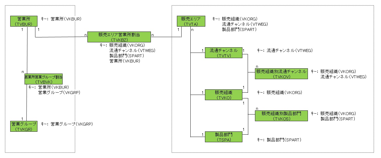 以下の図で出荷組織の各テーブルの関連関係を示します。