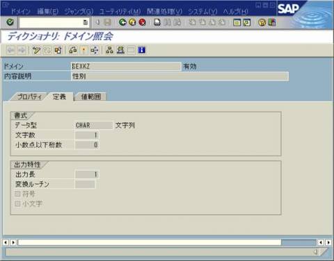 ドメインは項目の技術属性を定義するものであり、項目のデータ型と長さを指定することで項目の値範囲を記述します。 例として、「性別」のドメインの定義を次に示します。